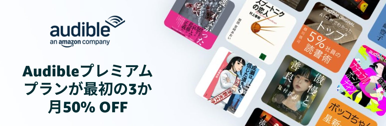 約30万以上の文芸やビジネス書をプロの声優の声で聴けるAudible。最初の3か月を50%OFFで視聴できるキャンペーンです。